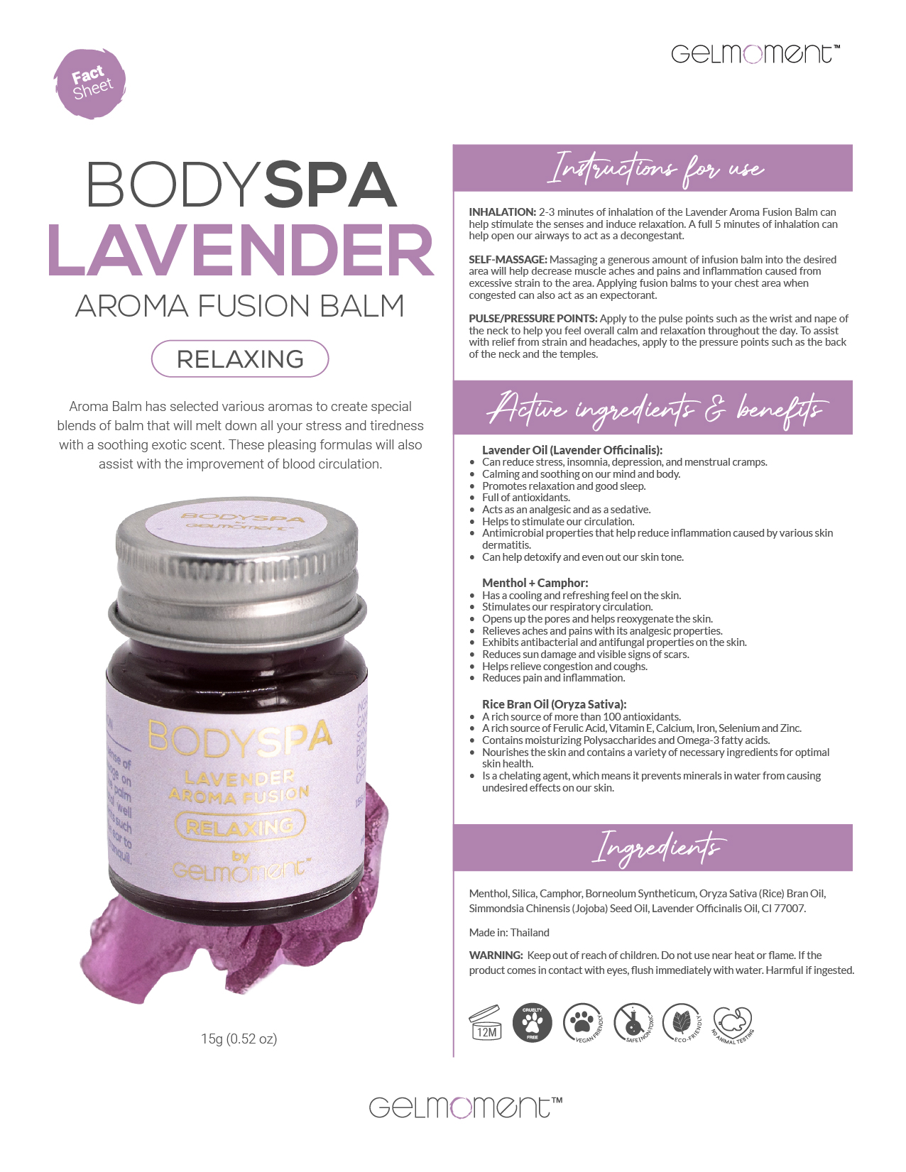 Lavender Aroma Balm has selected various aromas to create special blends of balm that will melt down all your stress and tiredness with a soothing exotic scent. These pleasing formulas will also help improve your blood circulation.